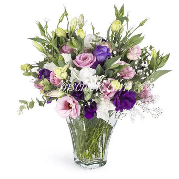 Cam Vazoda Renkli Lisyantus,Okaliptus ve Cipsofilya - Ürün Kodu:496